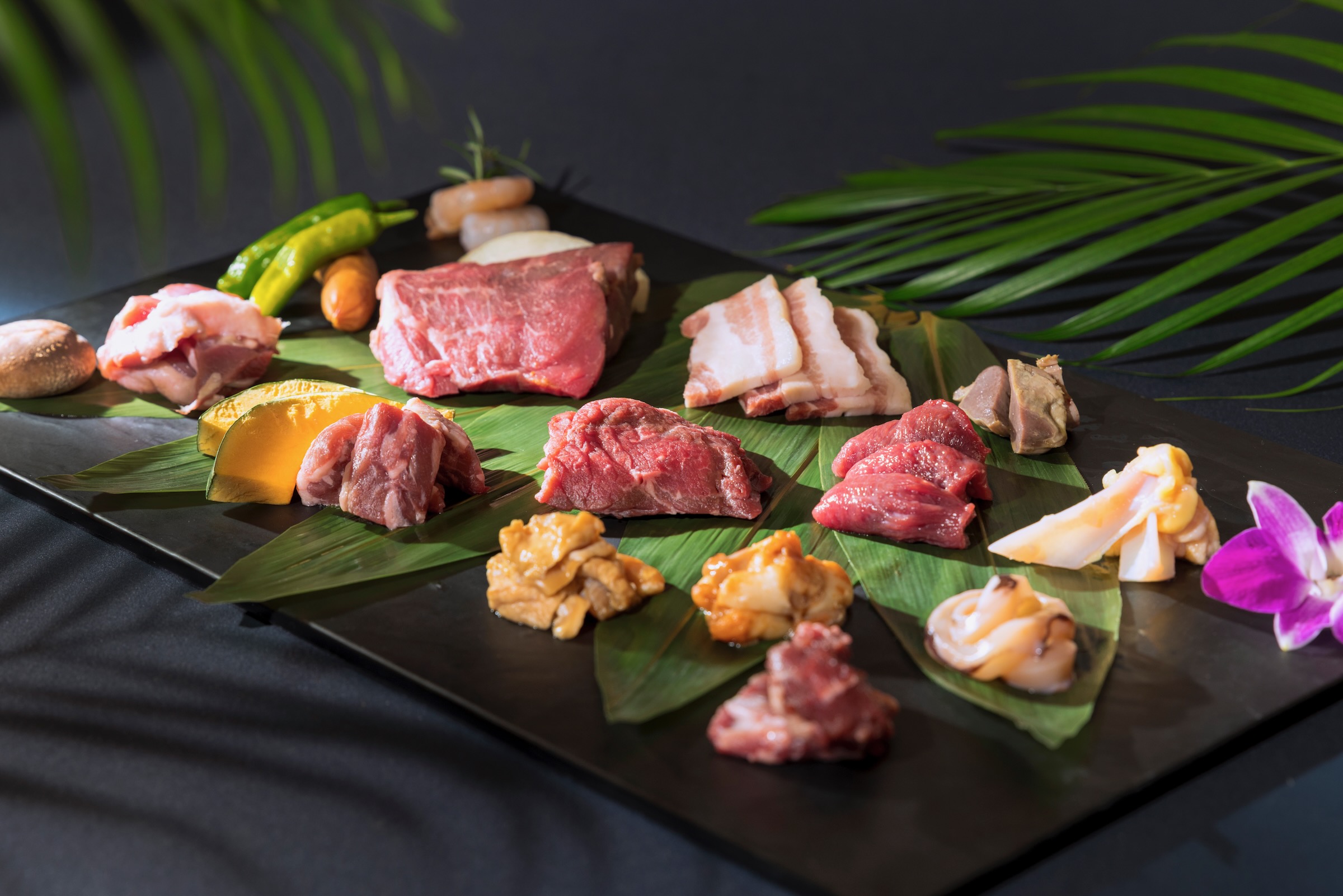 牛肩ロース、牛フィレサイド、牛中落カルビ、牛ハラミ、美川の上シロ、シーフード、野菜など、期間を通じて15種を食べ放題でご提供いたします。