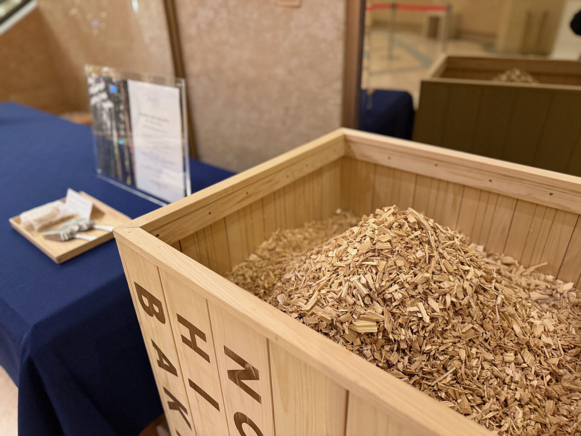 県⽊・能登ヒバ(ヒノキ科)のチップをご⽤意。抗菌・消臭にも使える⾃然素材で、お好みの量をお部屋に持ち帰っていただけます。森林の中にいるかのような、爽やかな⽊の⾹りで癒しの時間をお過ごしください。